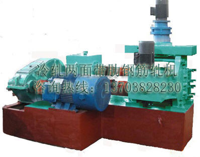 两肋冷轧机生产线主要的轧制生产工艺是:将Q215/Q235低碳钢盘圆经过硬质合金辊的轧制其表面形成月牙形的肋纹,再经过高频炉的加热去除钢筋表面的应力也就是肌肤效应,然后经过计米器和PLC的控制集中完成定尺剪断的一系列工艺,生产出来的产品色泽度好,各项理化指标都要优越于III级钢的标准,其市场差价在300元/吨,完全可以代替市场上的三级钢。